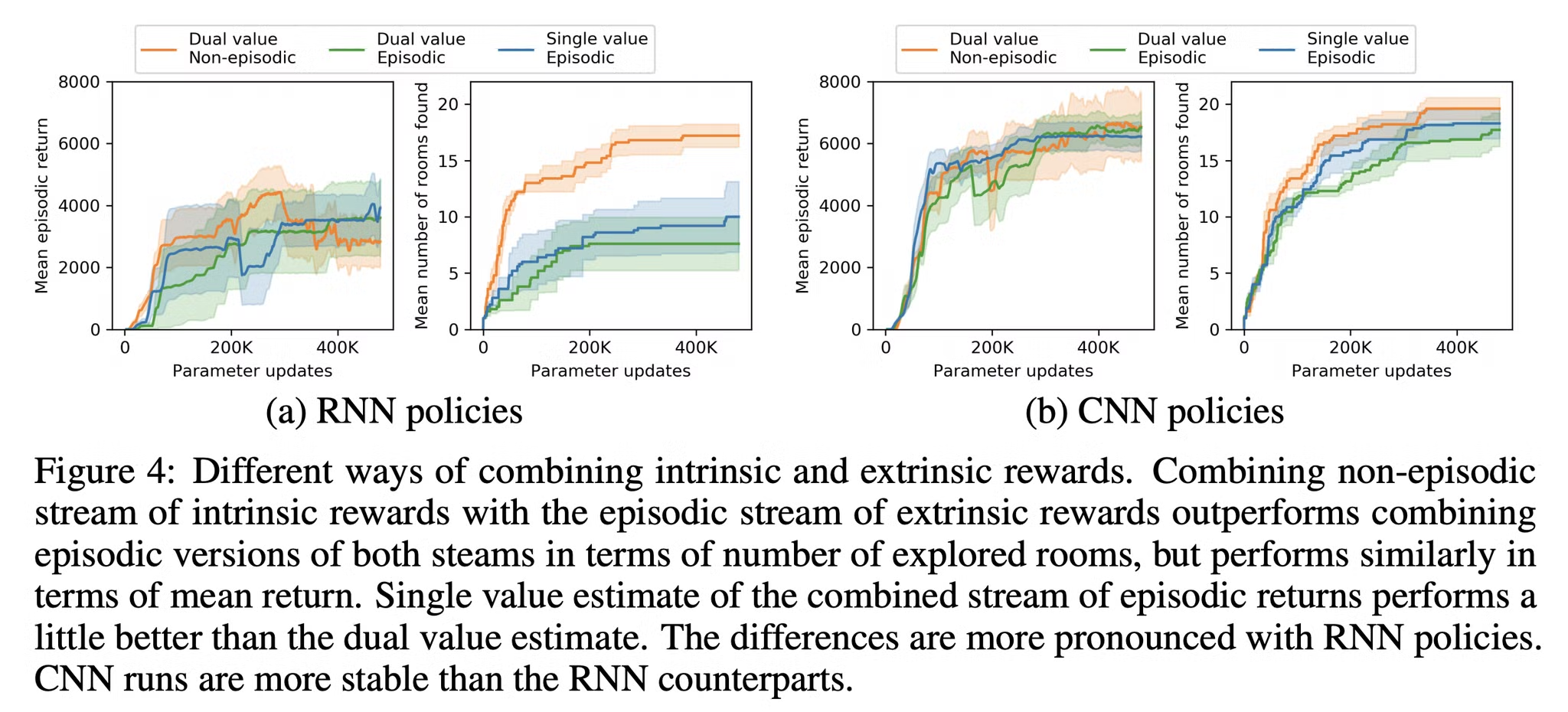 - Figure 4에서는 episodic intrinsic reward와 non-episodic intrinsic reward를 episodic extrinsic reward와 결합한 결과를 비교