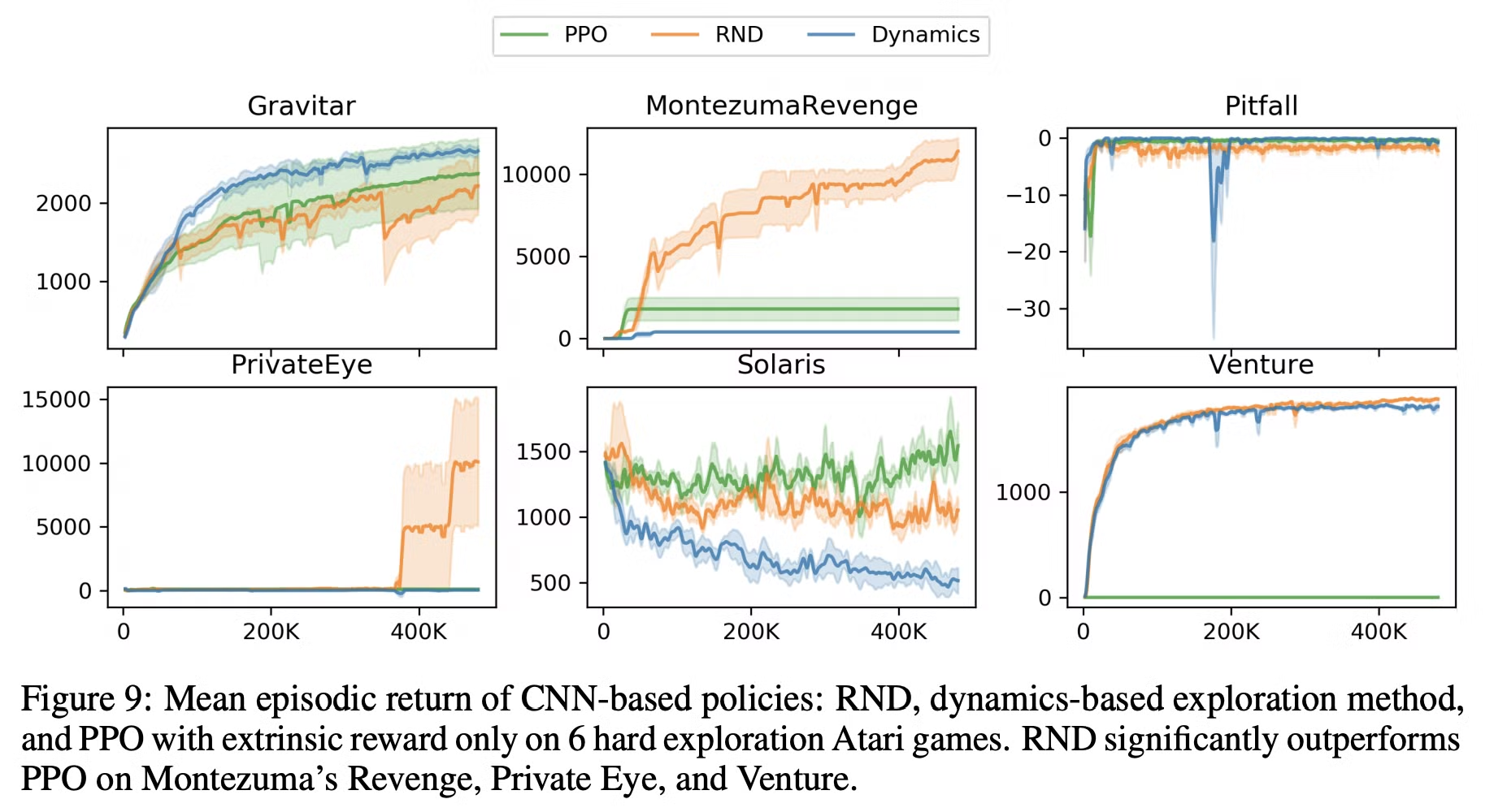 - Figure 9는 RND, PPO, dynamics prediction-based baseline을 CNN policy에 적용한 결과를 보여줌