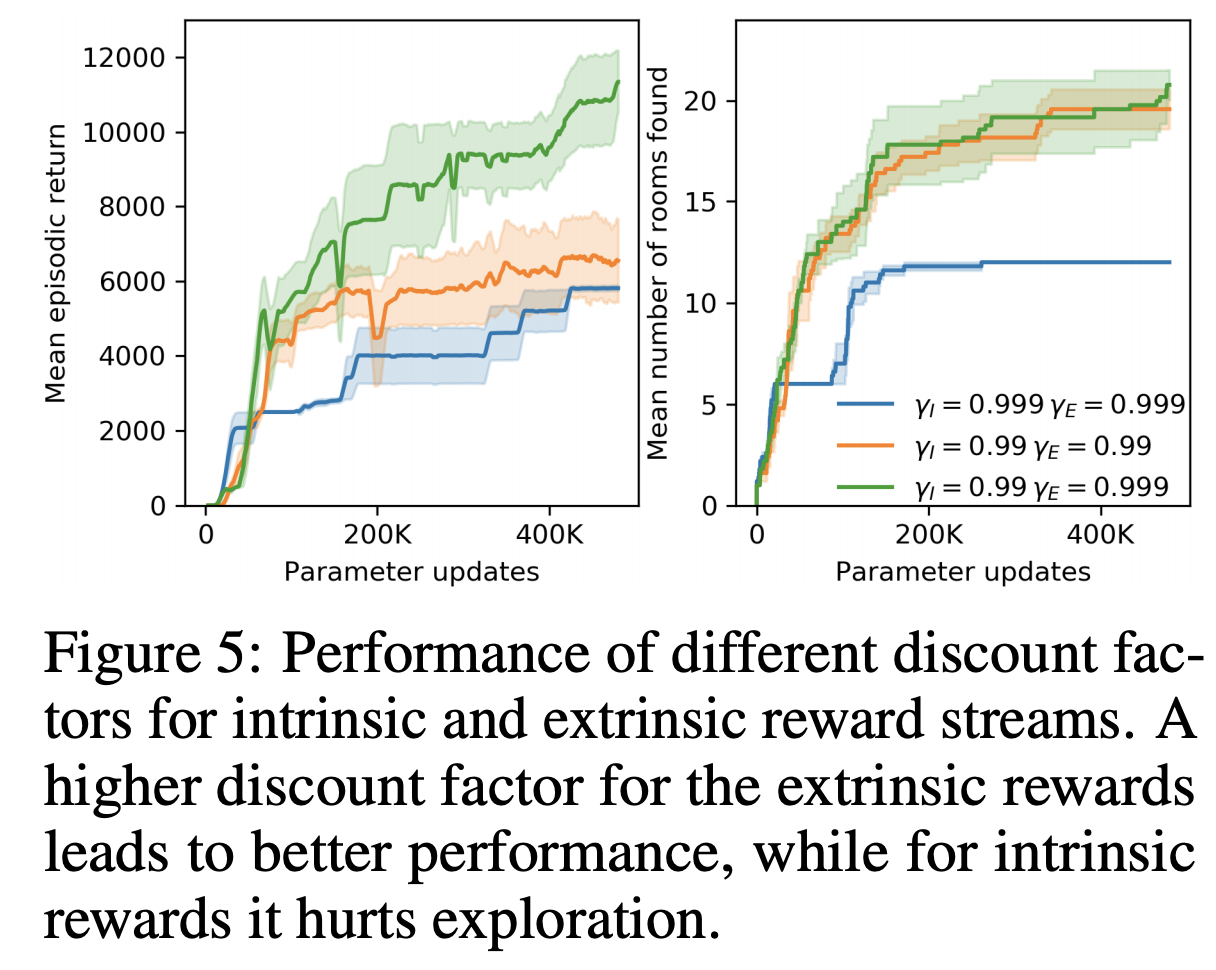 - 본 논문에서도 RND agent의 성능을 $\gamma_E \in \{0.99, 0.999\}$, $\gamma_I = 0.99$ 를 사용하여 결과 비교