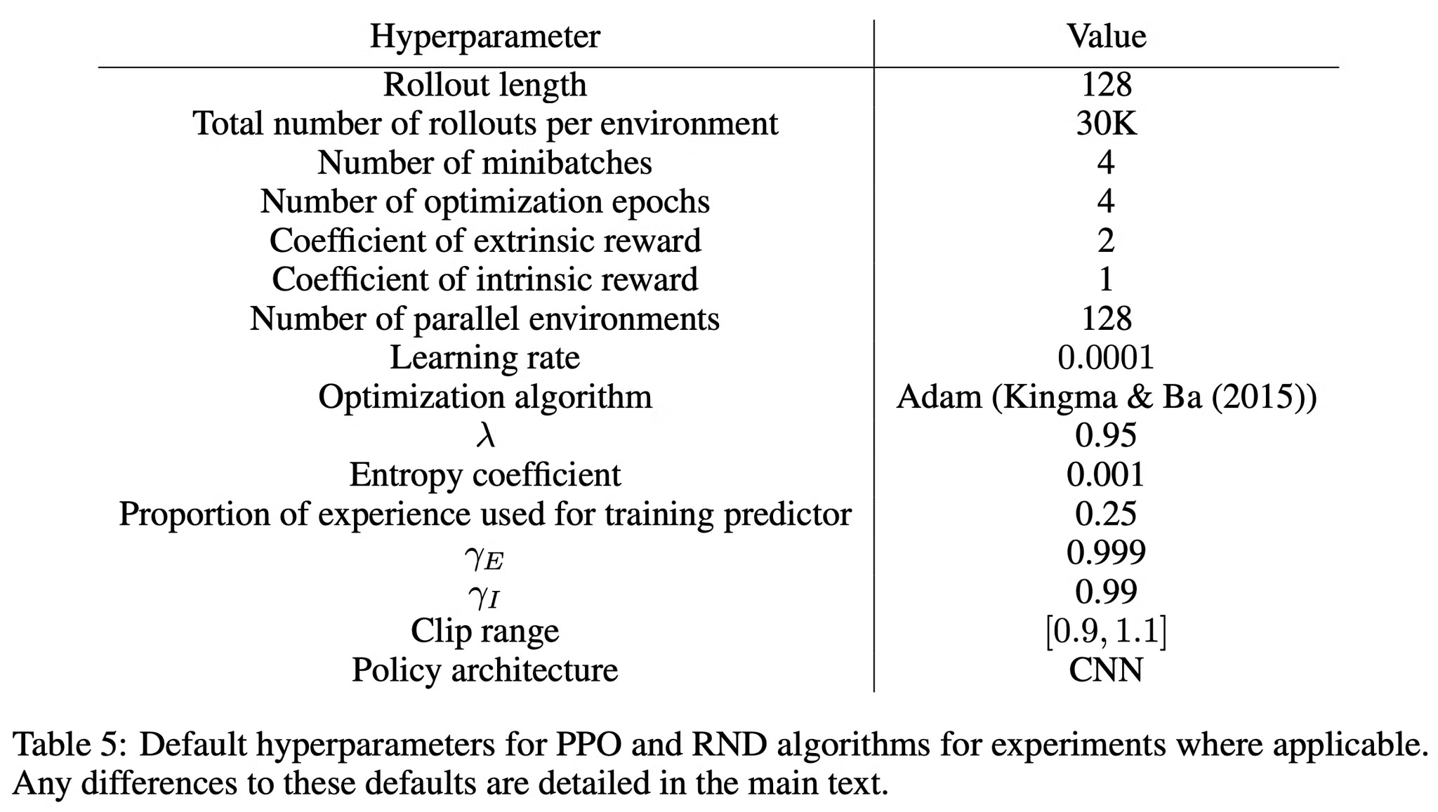 - PPO 알고리즘과 RND를 위해 추가된 hyperparameters