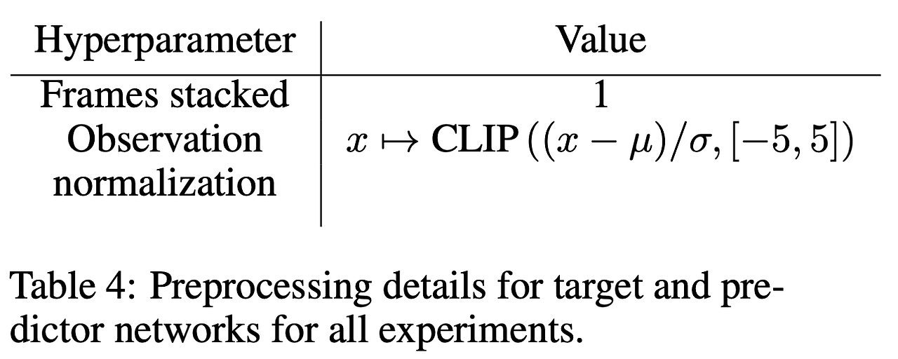 - Predictor와 Target network를 위한 추가적인 preprocessing detail: Table 4