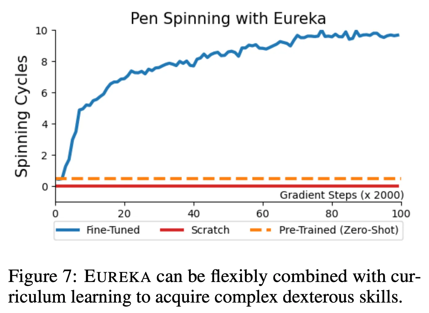 - EUREKA 파인튜닝은 빠르게 성공적으로 펜을 돌리는 정책을 달성