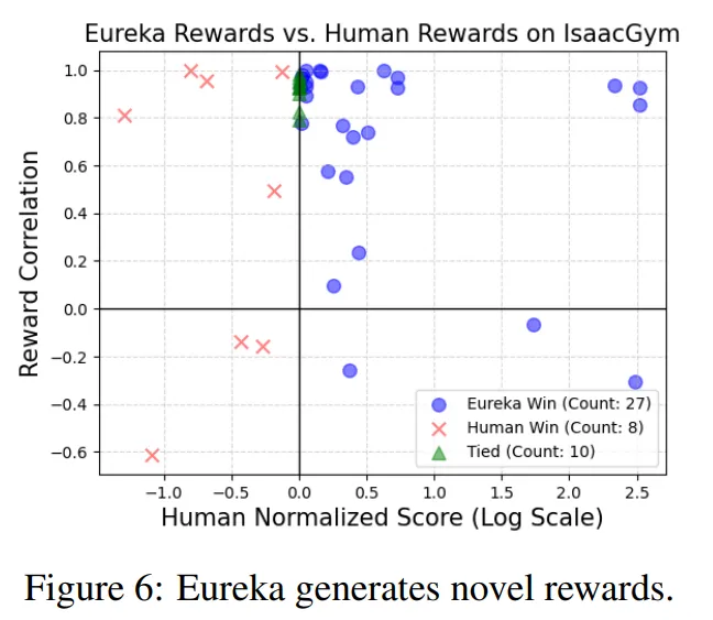 - 또한 몇몇 경우에서는 EUREKA 보상이 사람 보상과 음의 상관관계를 가지는데도 훨씬 더 잘 문제를 수행하는 것을 확인할 수 있음 → 이를 통해 EUREKA가 사람의 직관과는 다른 새로운 보상 디자인을 발견한다는 것을 알 수 있음 (부록 F.2 참고)