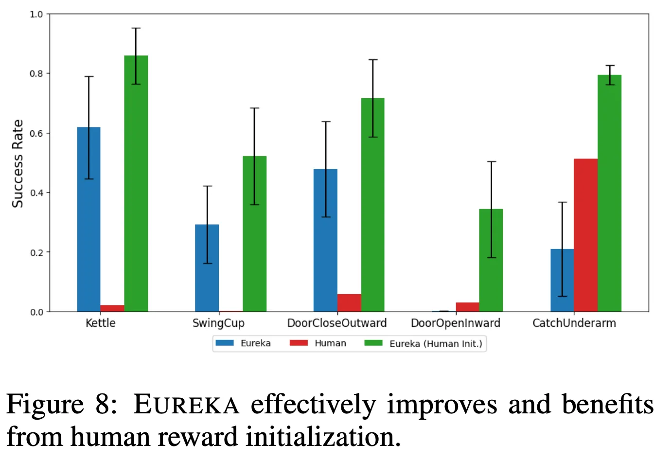 - 사람의 보상 함수로 초기화하여 시작하는 경우 EUREKA에 더욱 도움이 되는 것을 확인