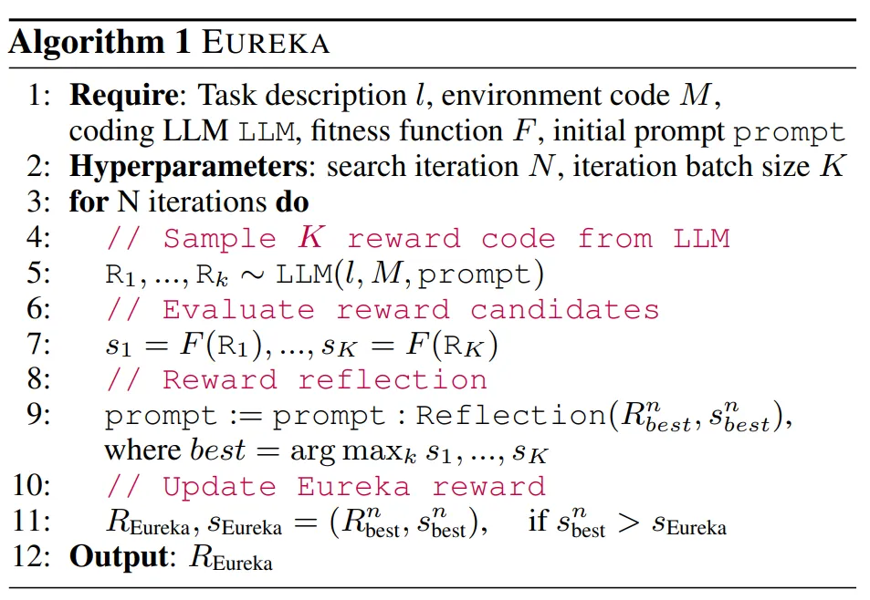 - 본 논문은 Evolution-driven Universal REward Kit for Agent (EUREKA) 알고리즘을 제안 → 코딩 LLM을 기반으로 하는 새로운 보상 디자인 알고리즘