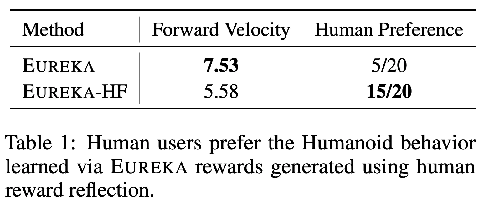 - 유사하게 사람의 피드백을 통해 에이전트의 행동에 대한 사람의 선호를 파악하고 보상함수 디자인을 보조할 수 있는 EUREKA의 능력도 선보임