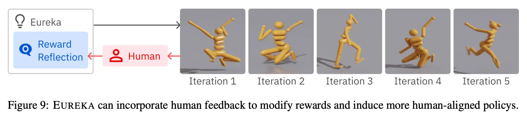 - 그림 9를 통해 각 사람 피드백 이후에 EUREKA로 학습된 행동이 진화하는 것을 확인 할 수 있음