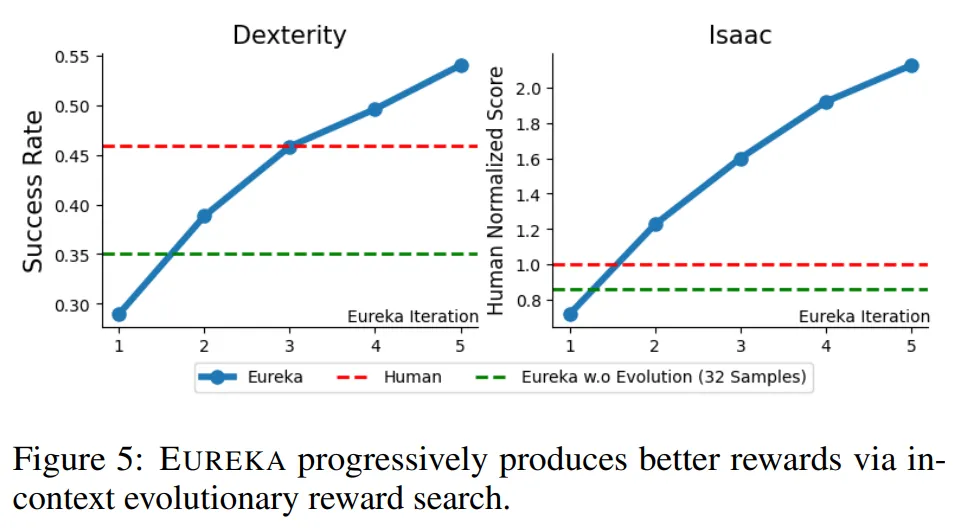 - 그림 5를 참고하면 각 진화 반복 후 EUREKA의 누적 최대 보상의 평균 성능 확인 가능