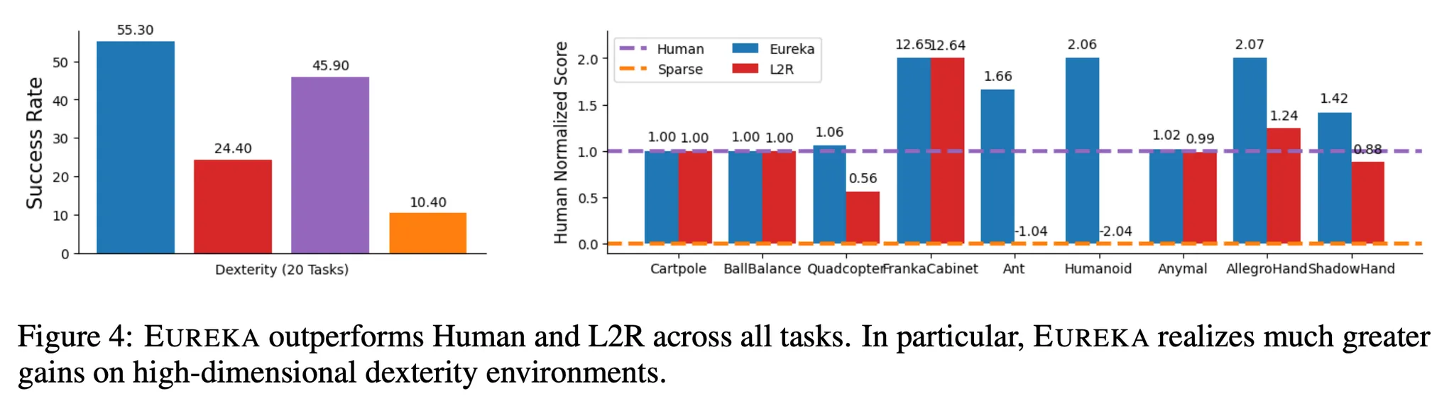 - EUREKA가 모든 Isaac 문제와 20개의 Dexterity 문제 중 15개에서 사람 수준과 유사하거나 더 뛰어난 성능을 보임