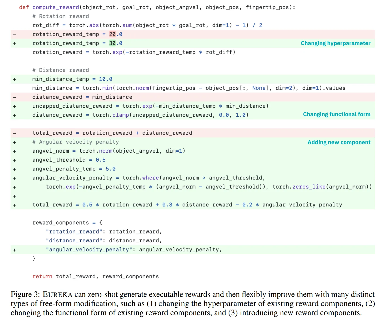- LLM이 instruction-following과 in-context 개선 능력이 있으므로 EUREKA는 정책 학습에 대한 텍스트 요약에 기반하여 기존 보상 코드를 수정하는 몇가지 일반적 방법을 제안하는 텍스트 프롬프트로 변형 연산자를 지정하여 이를 수행 → 보상 변형이 그림 3에서 시각화 됨