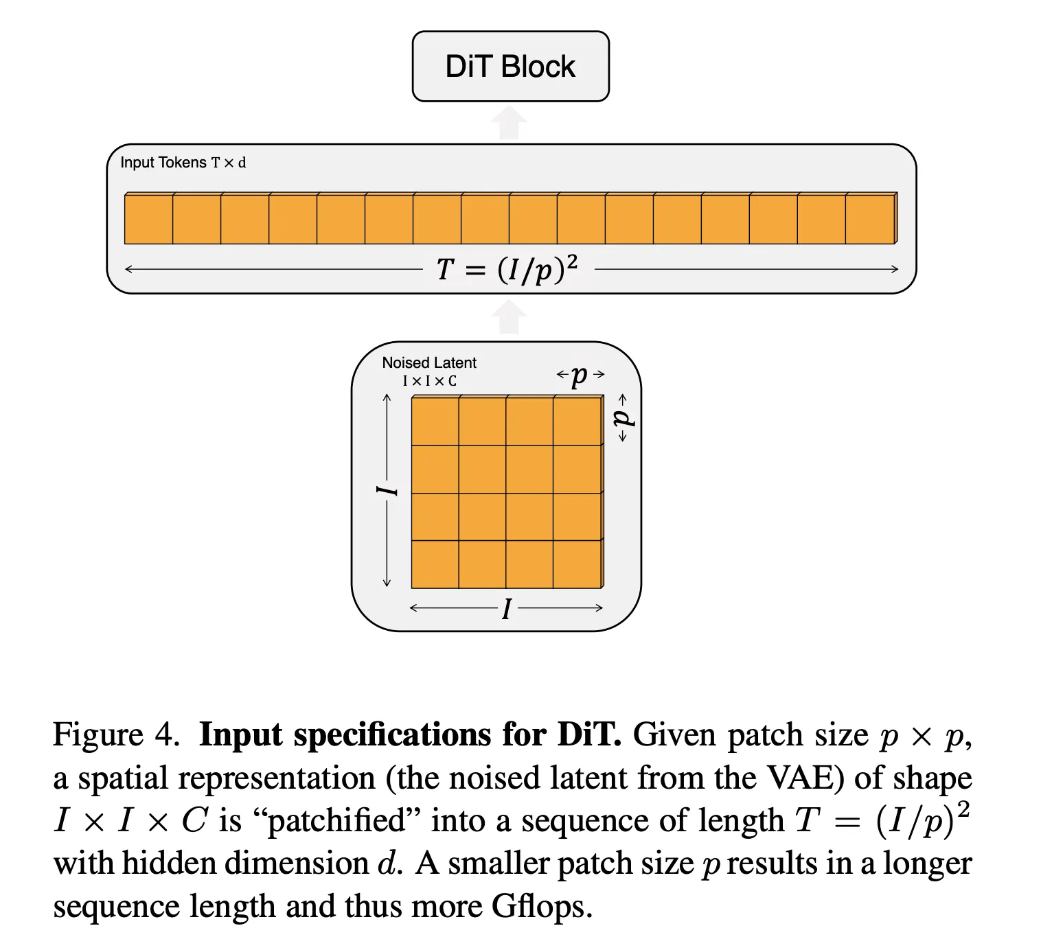 - DiT는 패치 (patch)의 시퀀스를 기반으로 동작하는 ViT (Vision Transformers) 구조를 기반으로 함