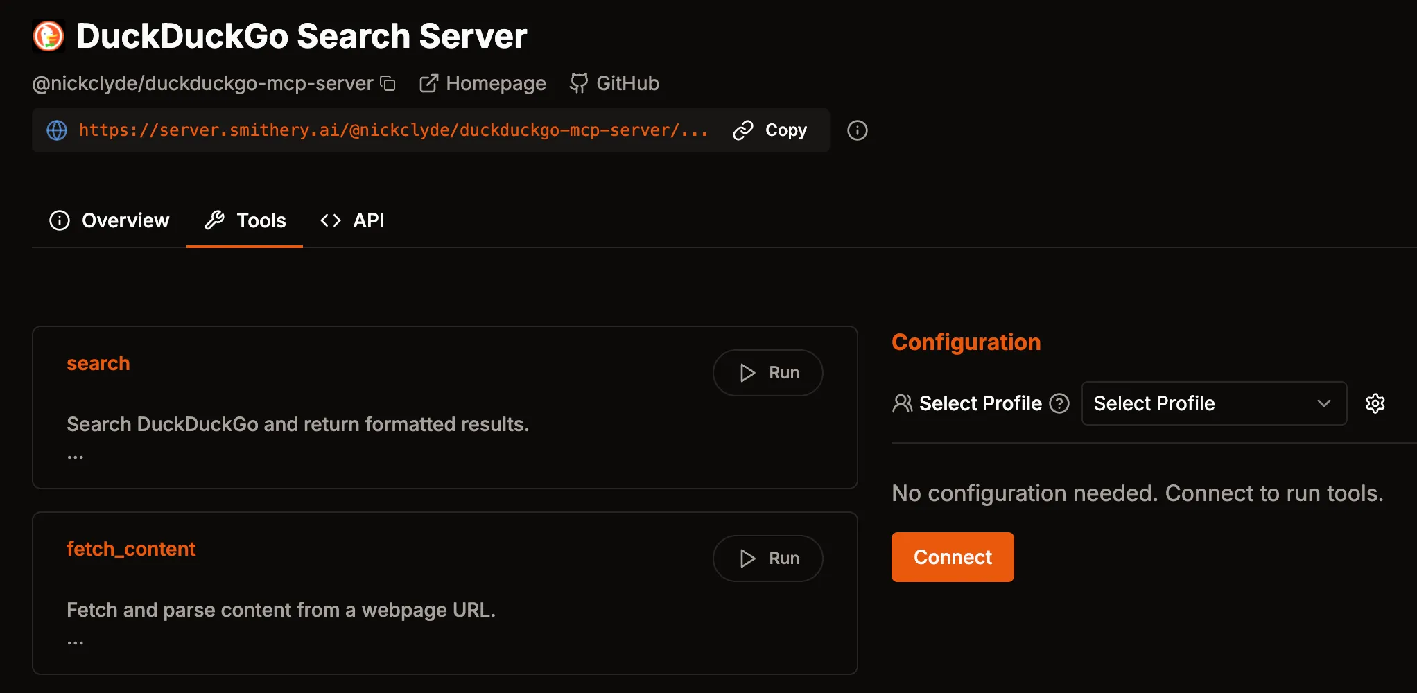 - 이 각각의 도구들을 Smithery 페이지에서 한번 사용해 볼 수 있습니다! 이 DuckDuckGo 페이지의 Tools 탭을 클릭하면 아래와 같은 화면을 확인할 수 있습니다. 여기서 우측의 Connect를 클릭합니다.