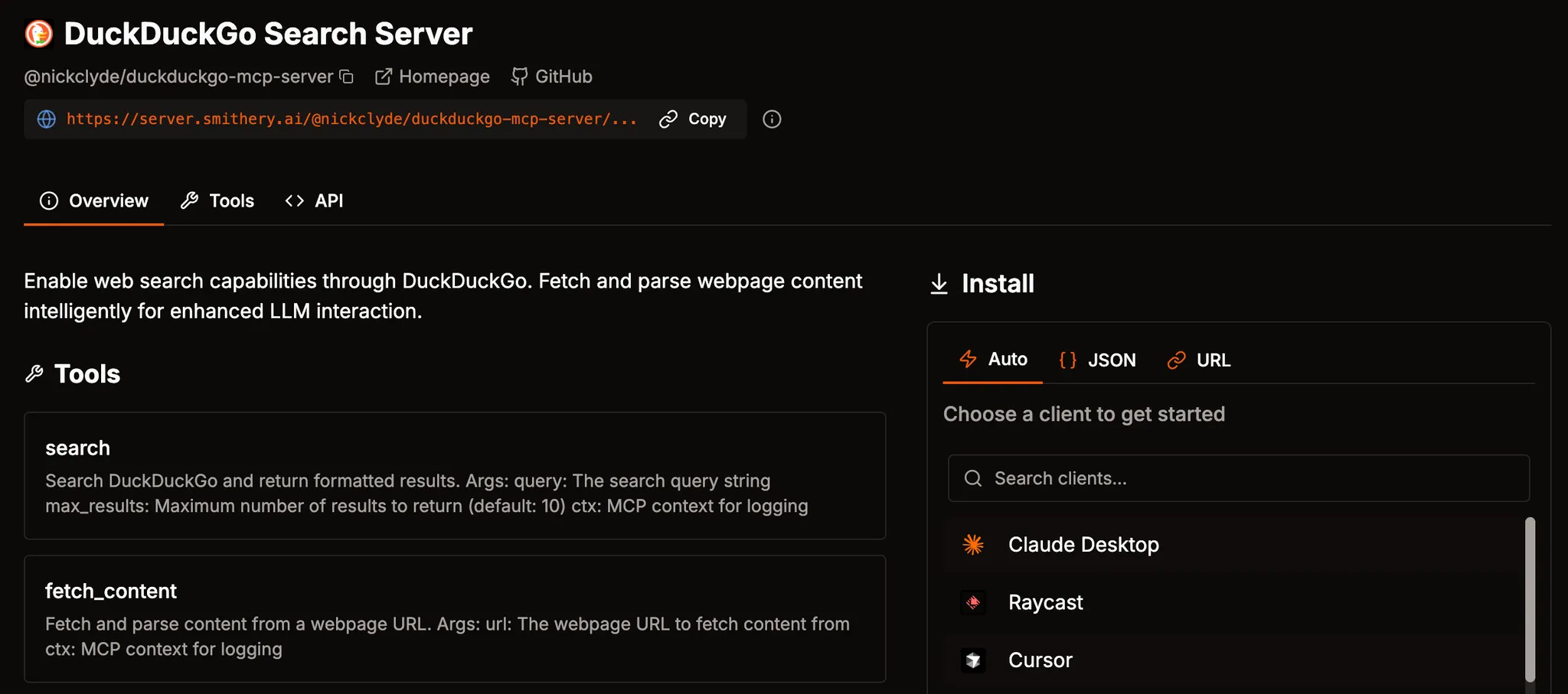 - 이렇게 Smithery를 사용하면 직접 MCP 서버를 구현할 필요 없이 이렇게 DuckDuckGo로 인터넷 검색도 하고 URL의 본문 내용도 불러올 수 있는 MCP 서버를 사용할 수 있습니다!! 😎
