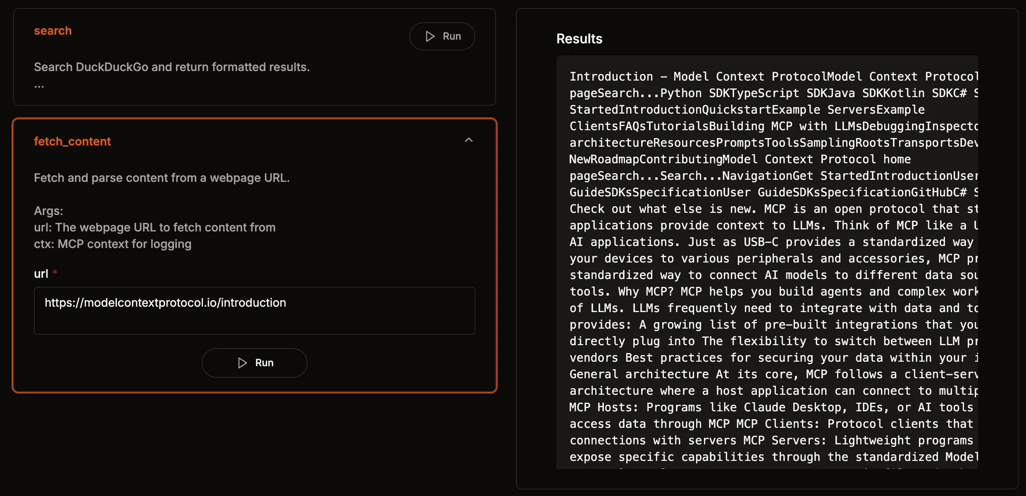 - fetch_content를 클릭한 다음 url에 방금 복사한 URL을 붙여넣습니다. 저의 경우 https://modelcontextprotocol.io/introduction 주소를 입력했습니다.