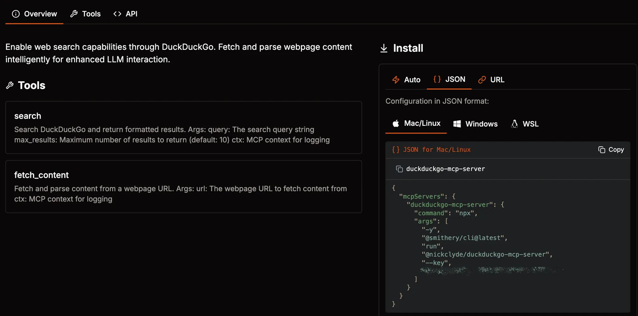 - DuckDuckGo Search Server의 Overview 페이지의 오른쪽에 있는 Install 탭에서 JSON을 선택합니다.