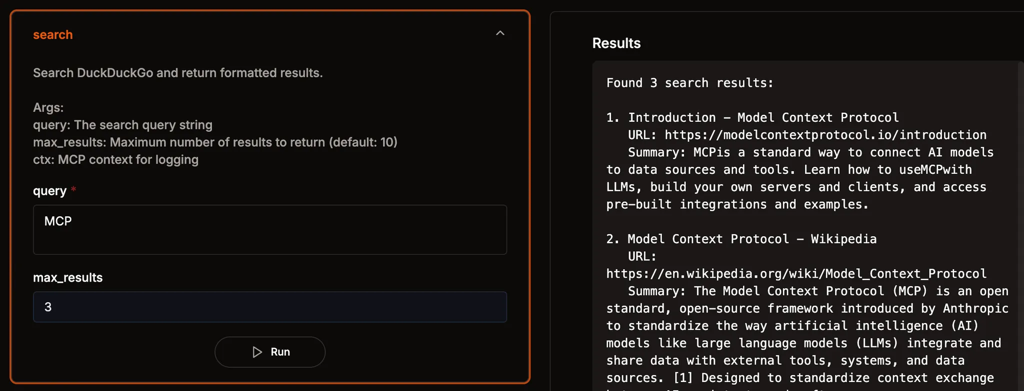 - 2개의 도구 중 search를 클릭하고 검색어인 query에는 MCP를 입력하고 최대 검색 결과의 수인 max_results는 3을 입력한 다음 하단의 Run을 클릭합니다.