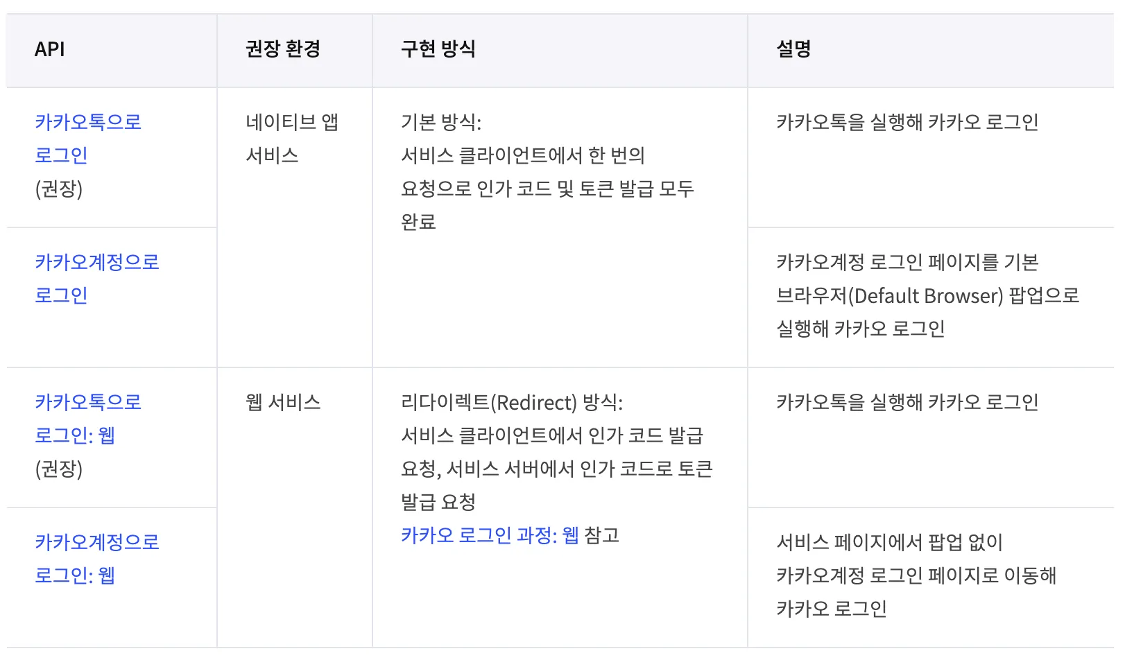 - 카카오를 기반으로 하는 로그인은 다음과 같이 앱 서비스와 웹 서비스환경에 대해 적용이 가능하고 이 중에서도 카카오톡을 실행해서 로그인 하는 방식과 카카오 계정 로그인 페이지로 로그인 하는 두가지 방식이 있습니다.