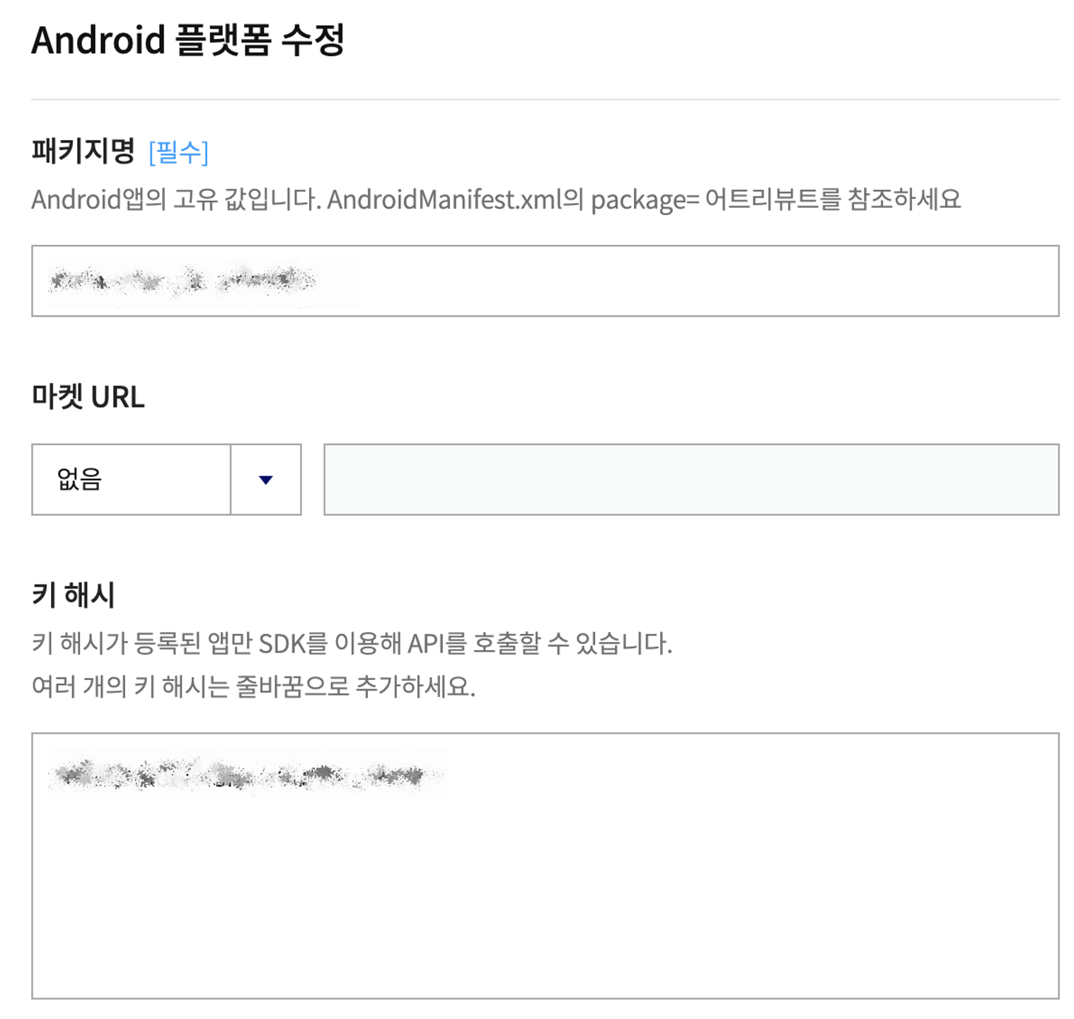 - 안드로이드는 아래 그림과 같이 패키지명과 키 해시를 입력해야합니다.