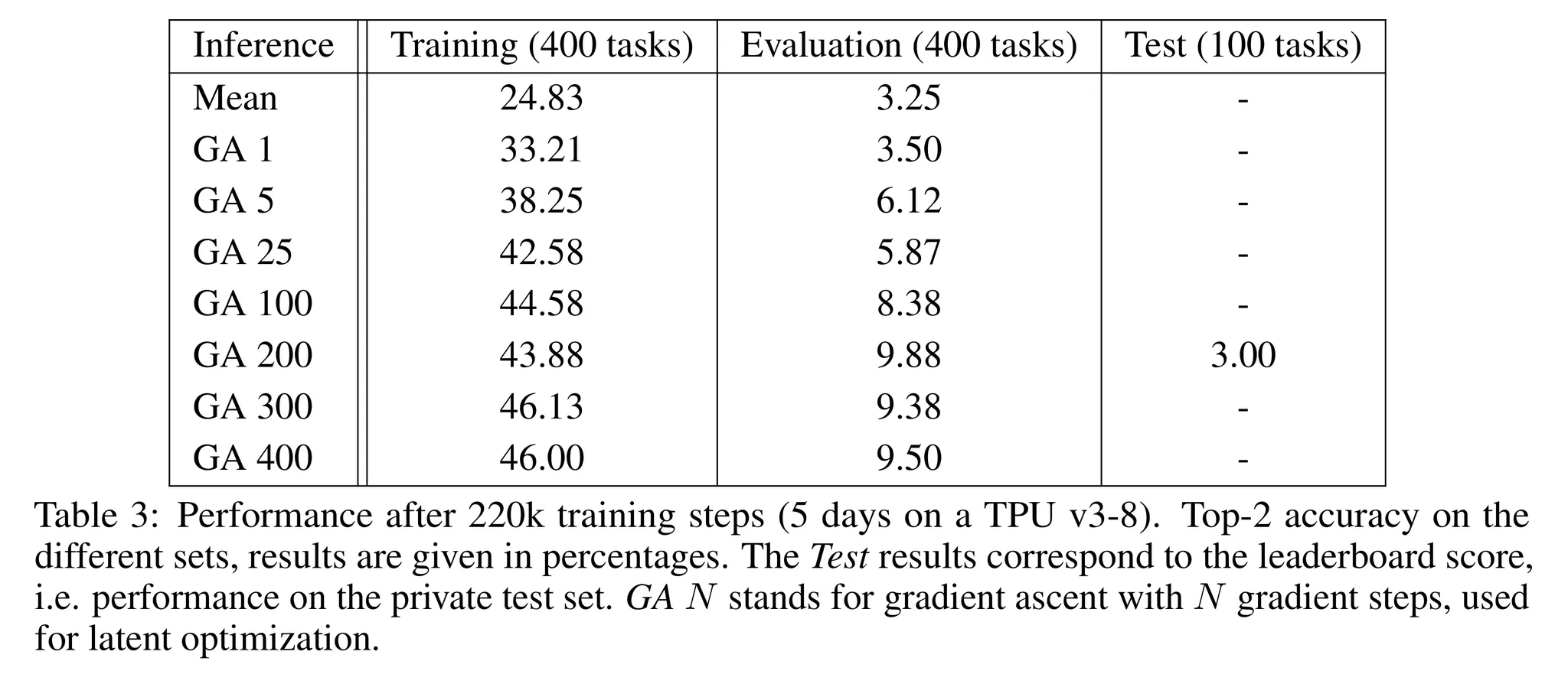 - ARC 테스트 셋의 경우 정답을 알 수 없으므로 가장 검증셋의 성능이 높은 설정을 사용 → 3%의 정확도 달성