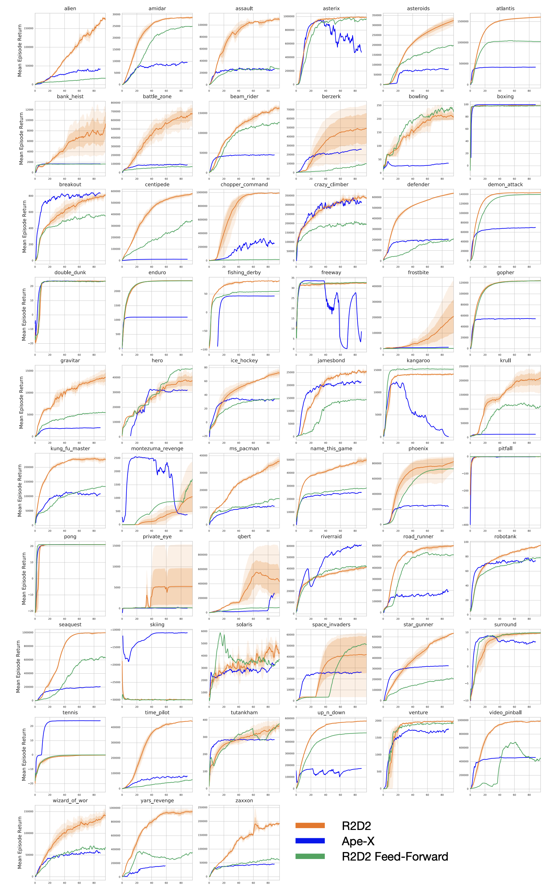 R2D2 Learning Curves on 57 Atari games