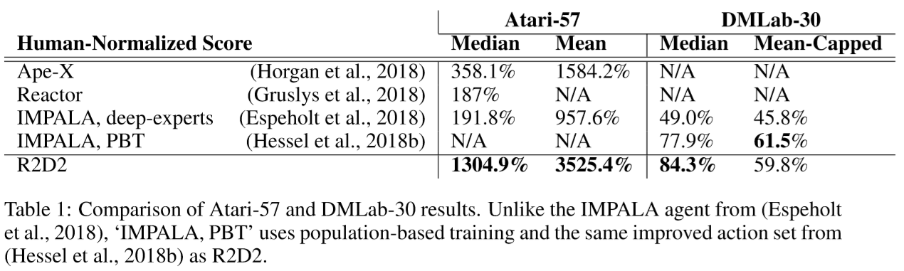 - Table 1에서는 population-based training (PBT) 버전의 IMPALA와 R2D2를 비교한 결과를 볼 수 있으며 R2D2가 훨씬 좋은 최종 median performance를 보이는 것을 알 수 있음
