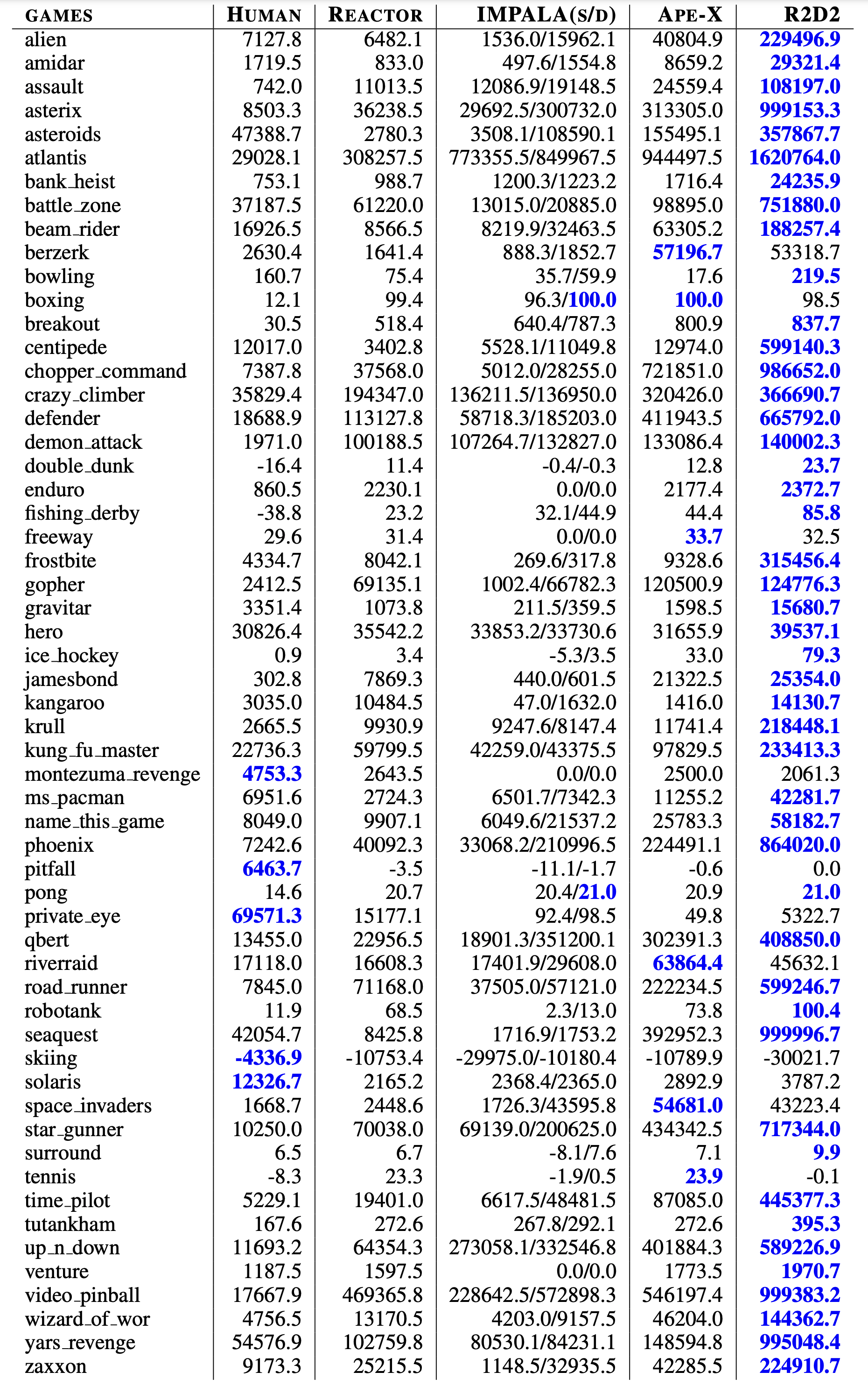- R2D2의 경우 57개의 게임 중 52개의 게임에서 super-human 성능을 보임