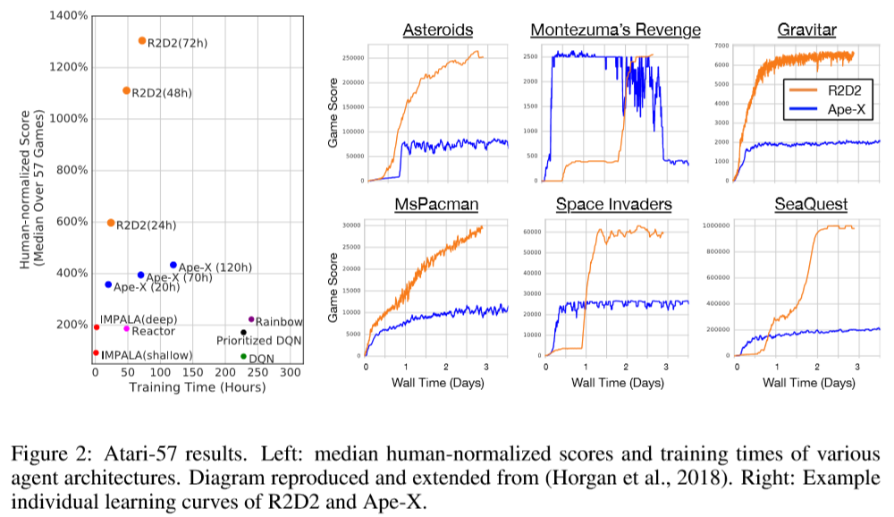 - Figure 2의 왼쪽 그래프는 타 기법들과 R2D2의 성능을 모든 Atari 게임에서 median human-normalized score로 비교한 것