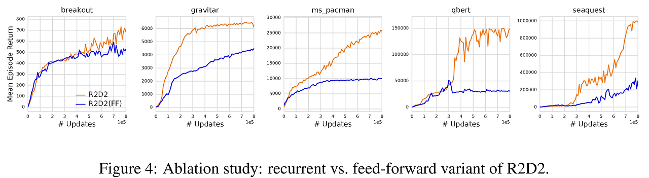 - 우선 LSTM이 R2D2의 성공에 얼마다 중요한 역할을 하는지 알아보기 위해 R2D2에 순수 feed-forward를 사용한 버전과 성능 비교를 진행함