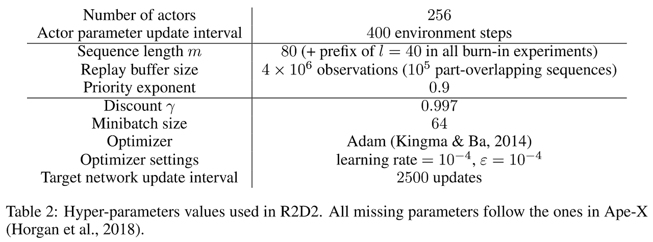 - R2D2가 IMPALA보다 작은 네트워크를 사용하고 모든 domain에서 동일한 hyper-parameter를 사용하면서도 훨씬 좋은 성능을 보이는 것을 알 수 있음