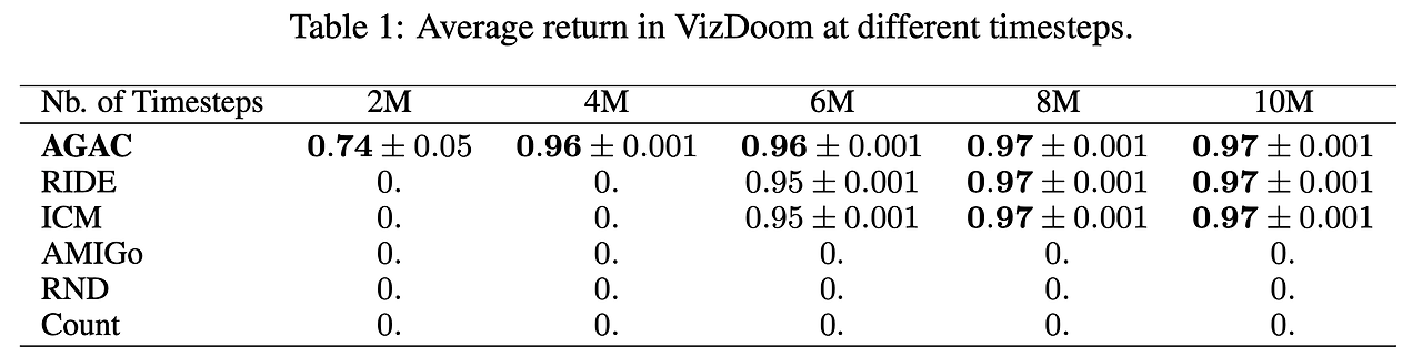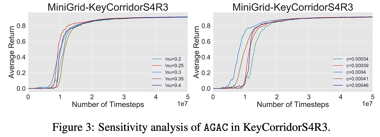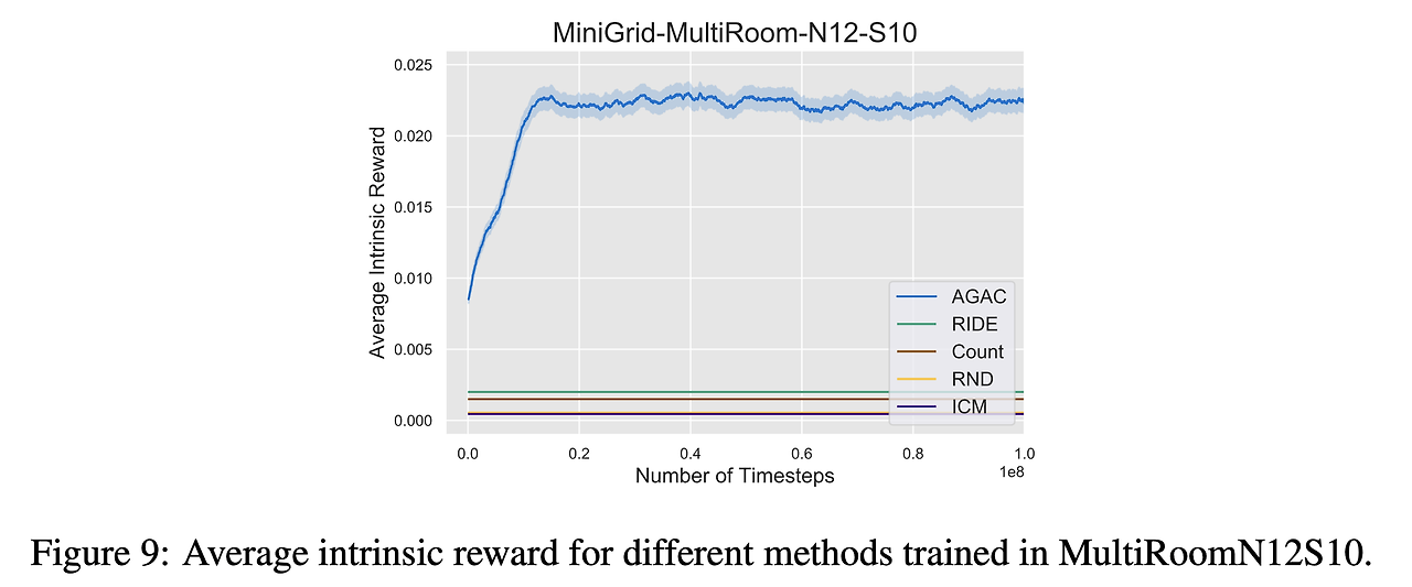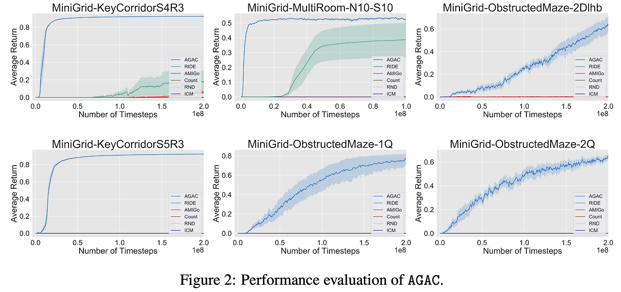 - 위의 결과를 봤을 때 MiniGrid에서도 AGAC가 다른 기법들에 비해 sample-efficiency나 성능 측면에서 훨씬 좋은 결과를 보인다는 것을 확인할 수 있음