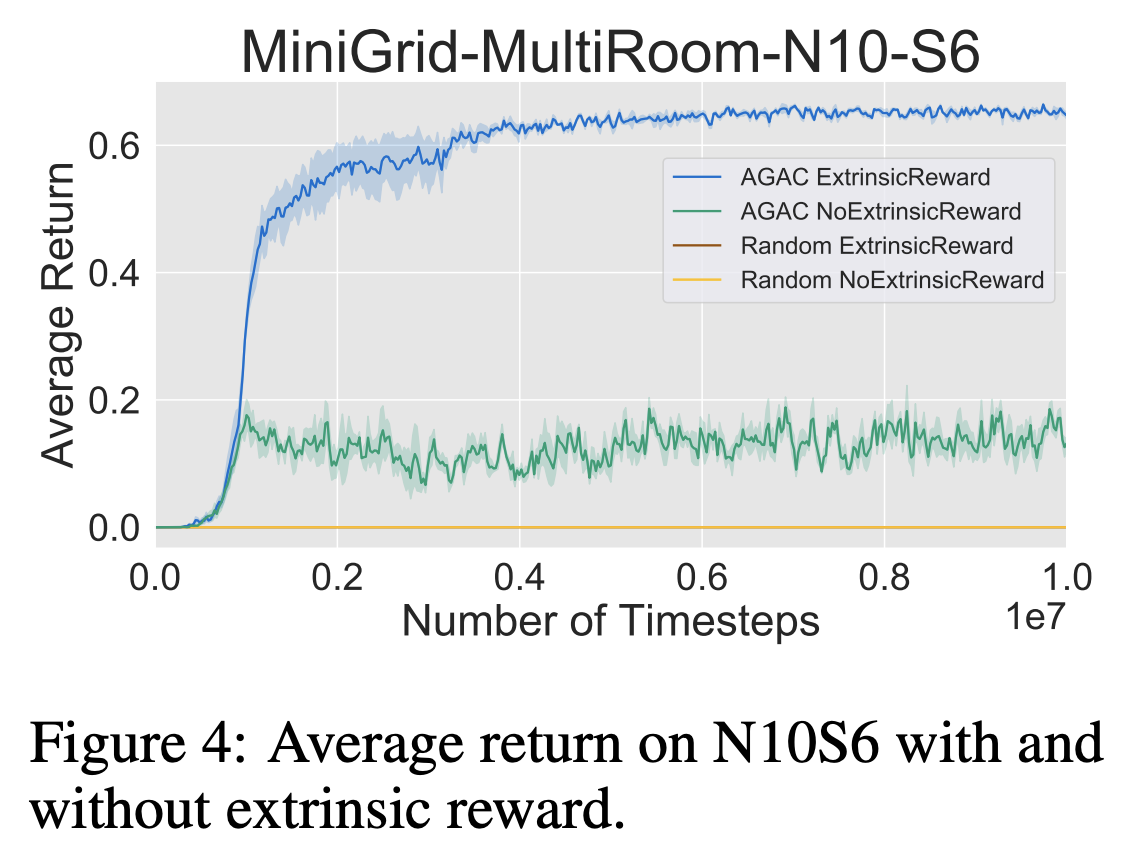 - Extrinsic reward 없이 AGAC가 얼마나 환경 내부를 잘 탐험할 수 있는지