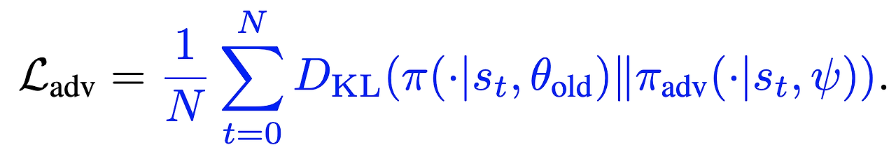 - $D_{KL}(\pi(\cdot|s)||\pi_{adv}(\cdot|s)) = E_{\pi(\cdot|s)}[\log \pi(\cdot|s) - \log \pi_{adv}(\cdot|s)]$