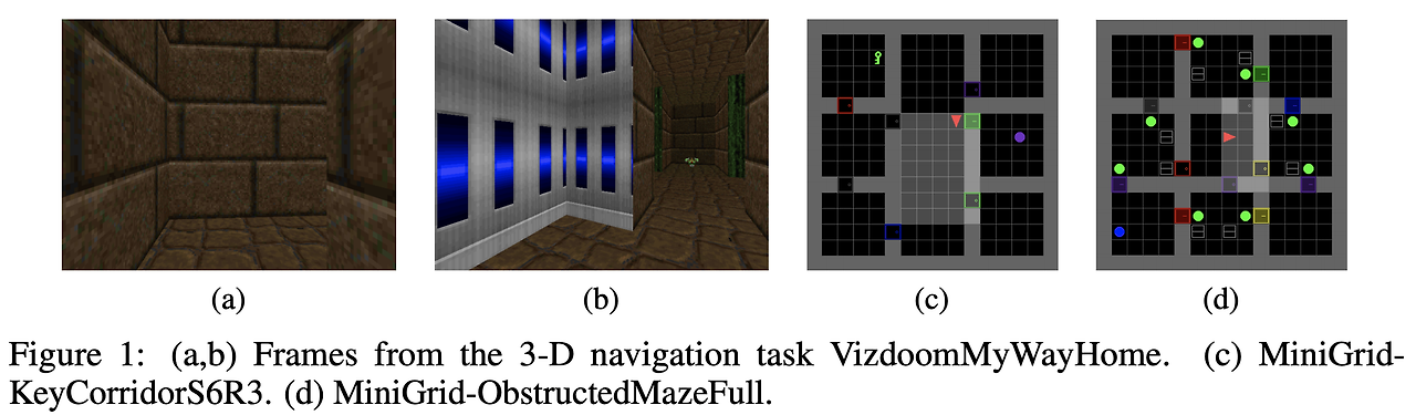 - VizDoom: 3D 환경에서 reward feedback 없이 복도를 지나 방으로 이동하는 방법을 학습해야함